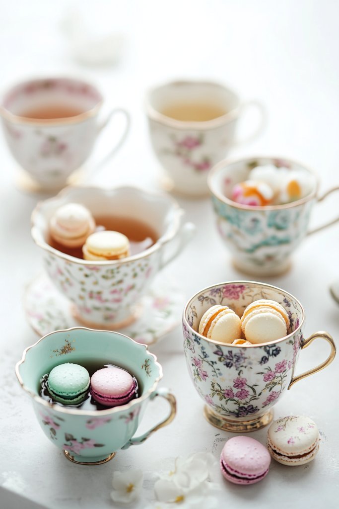Visualize a collection of delicate floral or pastel-colored tea cups arranged on a side table or dessert station. Mini desserts like macarons, petit fours, or scones are served in the cups, creating a whimsical, refined vibe. The mismatched sets add personality, while their intricate patterns and soft colors complement spring’s fresh palette. Light catches the glossy glaze, making each piece sparkle.