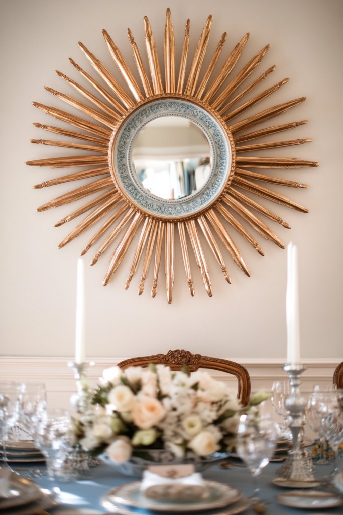 Want to instantly elevate your table’s visual impact? A sunburst mirror or a large decorative plate hung above the table acts as a stunning focal point. It draws the eye upward, adds depth, and creates a sense of grandeur—even in a modest space. It’s a bold statement that ties your entire decor together.