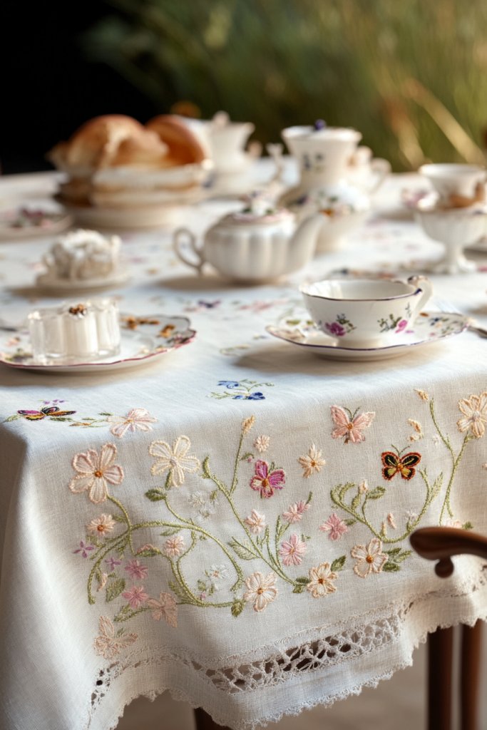 13. Linen Tablecloths with Embroidered Spring Motifs
