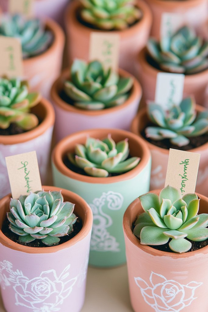 Picture small terracotta pots painted in pastel shades or with hand-drawn designs, each hosting a tiny succulent. The lush green rosettes contrast beautifully with the painted exteriors, creating a coordinated yet eclectic look. Place each pot at a guest’s seat, with a personalized tag or name card attached. The overall effect is charming, earthy, and inviting, perfect for spring.