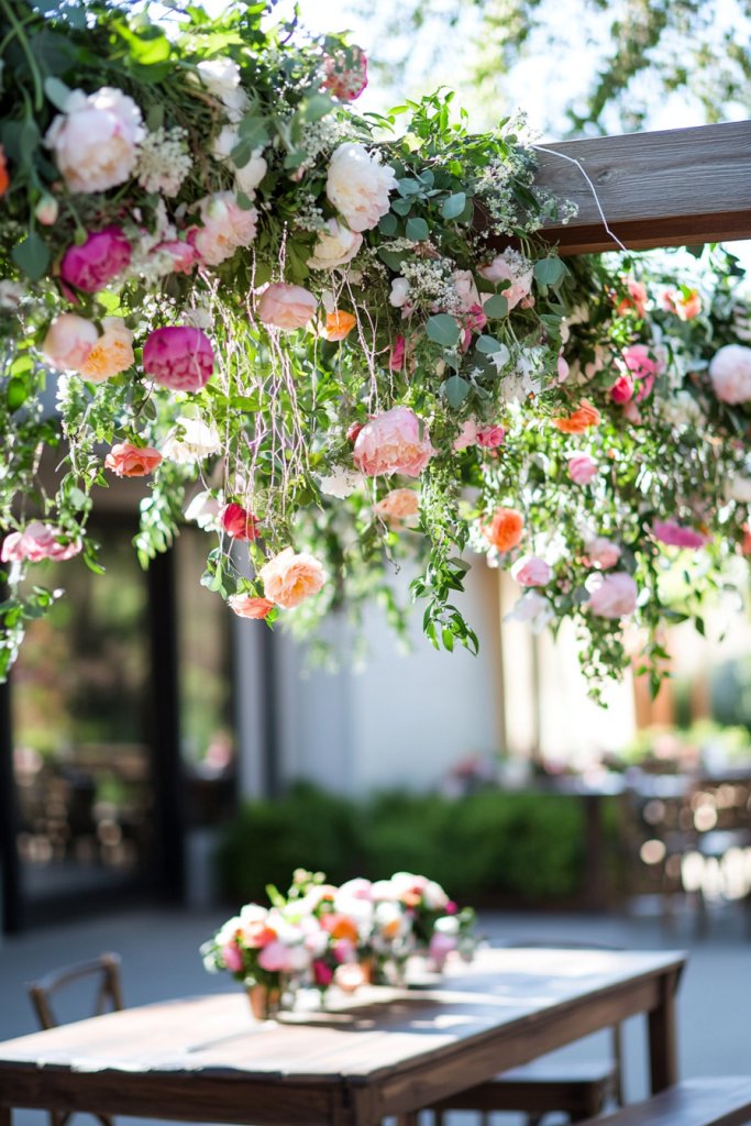 Imagine strings of faux or silk flowers in soft pastel shades draping across the ceiling or along the walls. The garlands are lush with roses, peonies, or sweet peas, creating a canopy of blooms overhead. Soft sunlight filters through the flowers, casting gentle shadows and filling the space with a floral fragrance. The effect is enchanting, playful, and inviting for guests.