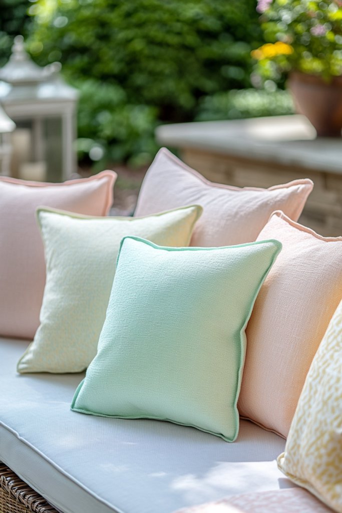 Picture a variety of pillows in pastel hues—blush pinks, mint greens, and soft yellows—scattered across your sofas or outdoor chairs. Textures range from smooth and crisp to chunky knit, creating visual interest. The fabrics catch the light, making your seating area look cheerful and welcoming. Some pillows might feature embroidered motifs or printed patterns inspired by spring blooms.