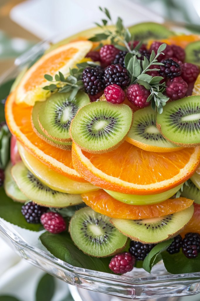 Imagine a shallow bowl or basket layered with slices of citrus, berries, and tropical fruits, topped with sprigs of greenery like mint or lemon balm. The bright colors and natural textures create a lively tableau that draws attention. The fruit’s glossy surfaces contrast with the matte leaves, making each element pop visually. It’s a feast for the eyes and the palate, hinting at the delicious offerings to come.