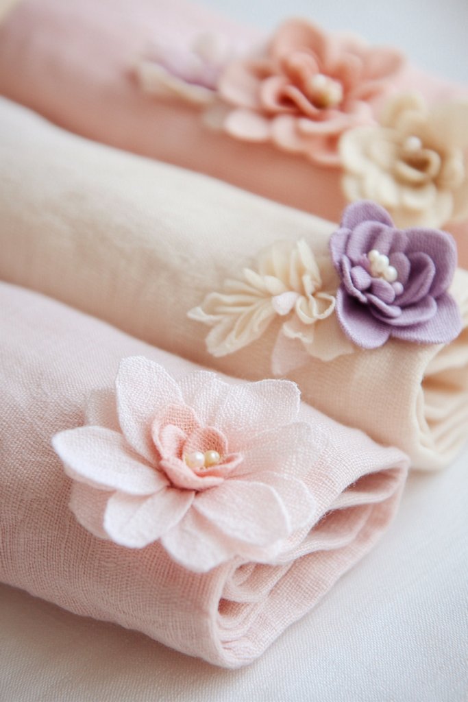 Imagine crisp linen napkins beautifully folded and adorned with small fabric flowers—roses, daisies, or peonies—attached with a pin or stitched in place. The flowers are made from colorful, textured fabrics that mimic real blooms, adding a tactile element. The combination of natural linen and vibrant floral accents creates a fresh, romantic aesthetic perfect for spring.