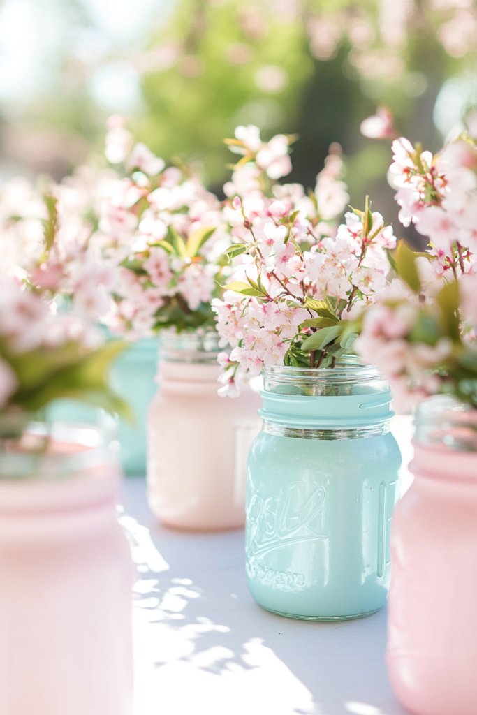 Picture several mason jars in blush pink, mint green, and baby blue lined up along your table. Each one is filled with delicate cherry blossoms, their pale pink petals contrasting beautifully with the pastel-painted glass. The jars sit atop a linen cloth, catching the light and casting gentle shadows. Their simple, rounded shapes add a cozy, welcoming feel, inviting guests to gather around.