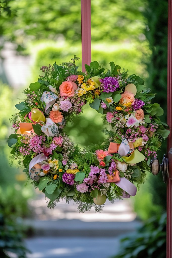 Imagine a vibrant wreath made of faux or real flowers, greenery, and seasonal accents like eggs or ribbons. Hung on your front door or entryway, it bursts with color and texture—think soft pinks, fresh greens, and delicate blooms. The wreath’s layered elements create depth and visual interest, making your home look warm and welcoming. The aroma of fresh or faux flowers adds to the sensory experience.
