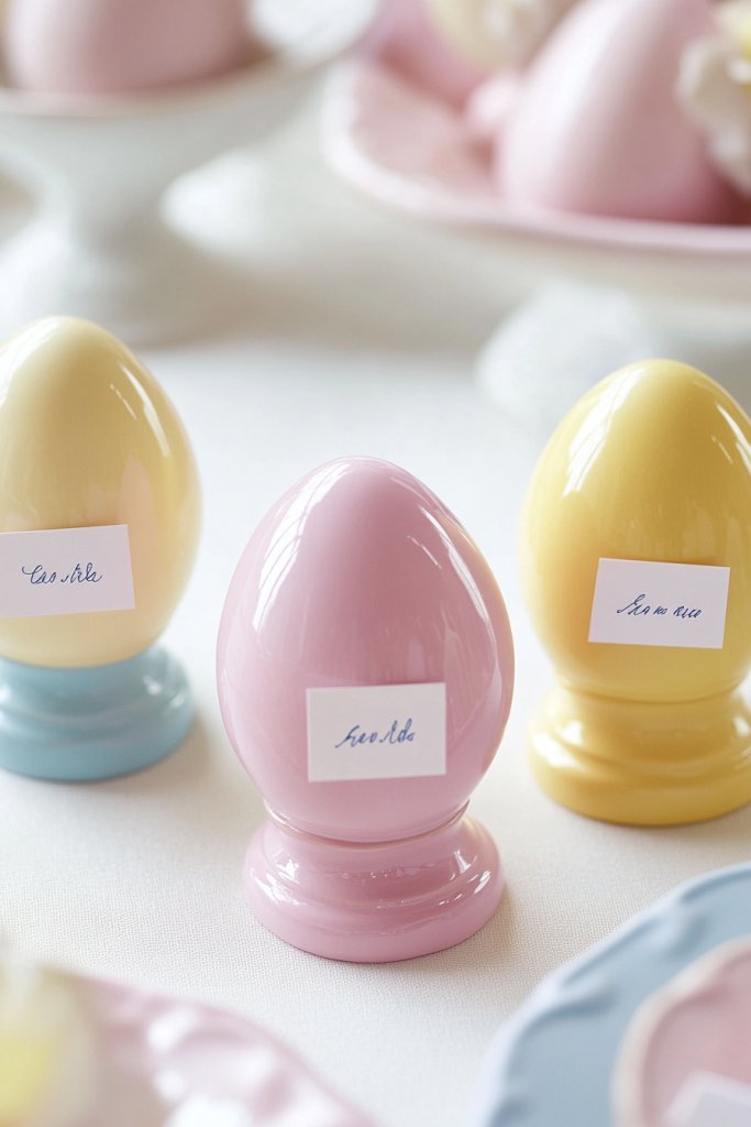 Imagine tiny ceramic eggs nestled on each plate, with delicate handwritten or printed place cards tucked inside. The eggs are painted in soft pastel shades—think mint, lemon, and blush—with subtle speckles or floral accents. They sit atop crisp napkins or small charger plates, instantly elevating the table’s charm. The overall effect is lighthearted, inviting guests to smile as they find their seats.