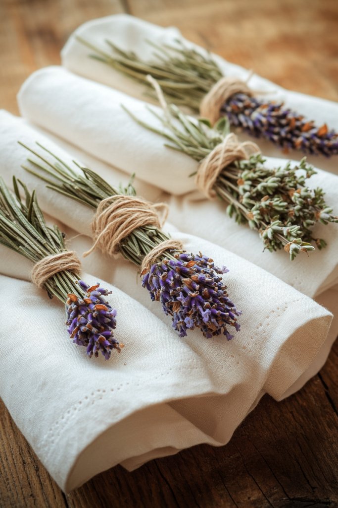 Picture your linen or cotton napkins wrapped in natural twine, with sprigs of dried lavender, thyme, or rosemary tucked underneath. The herbs add a muted, earthy color palette that pairs beautifully with spring pastels. The twine is tied in a simple bow or knot, holding the herbs securely in place. As guests unfold their napkins, they’re greeted with a gentle herbal scent that enhances the dining experience.