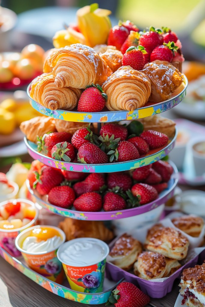 Ever struggle with serving a variety of breakfast goodies in an appealing way? A colorful tiered tray is your solution—combining practicality with eye-catching presentation. It keeps everything within easy reach and makes your brunch look like a gourmet spread. Plus, it adds height and dimension to your table setup.