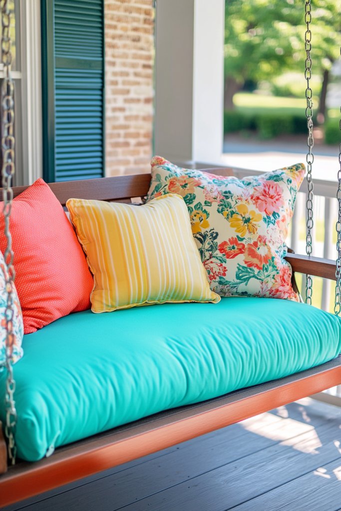 9. Bright Cushioned Swing or Bench with Spring Throw Pillows