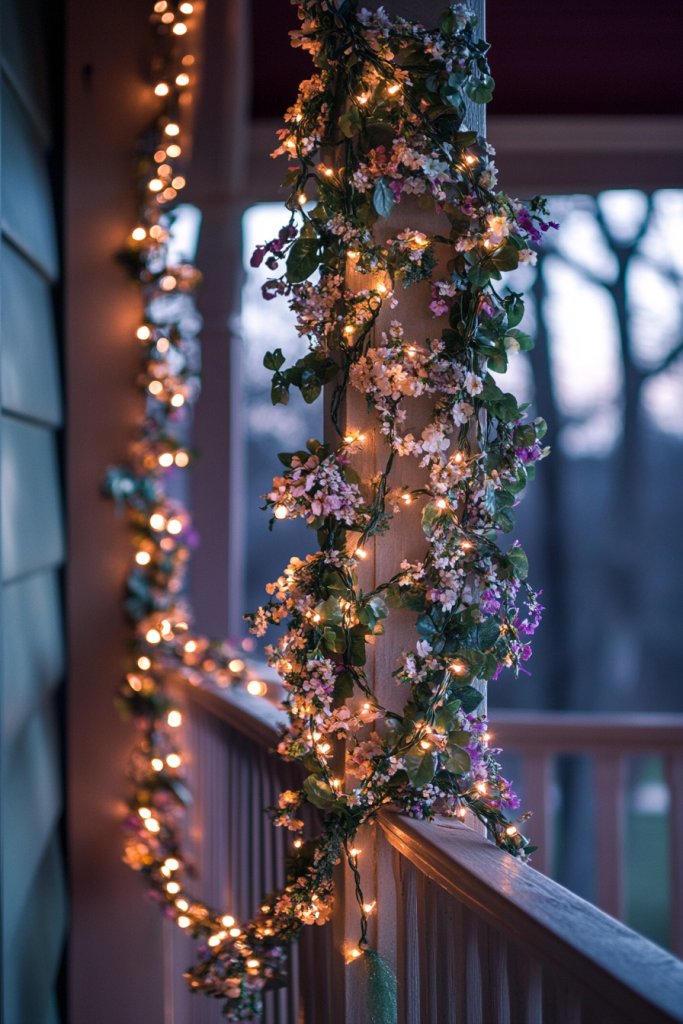 Choose warm-white or soft-colored LED fairy lights for a gentle glow. Wrap them around porch columns, railings, or beams, or hang them loosely for a more casual look. Combine with faux floral garlands or simple fabric ribbons for a layered effect. During different seasons, swap out garland accents—think faux berries or seasonal motifs—to keep the look fresh. Drape lights over a pergola or trellis for extra drama.