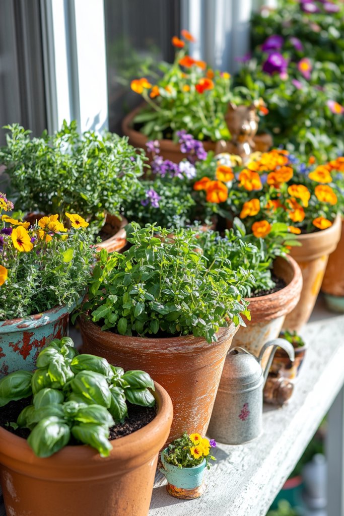 11. Cheerful Garden-Style Planters with Herbs and Flowers