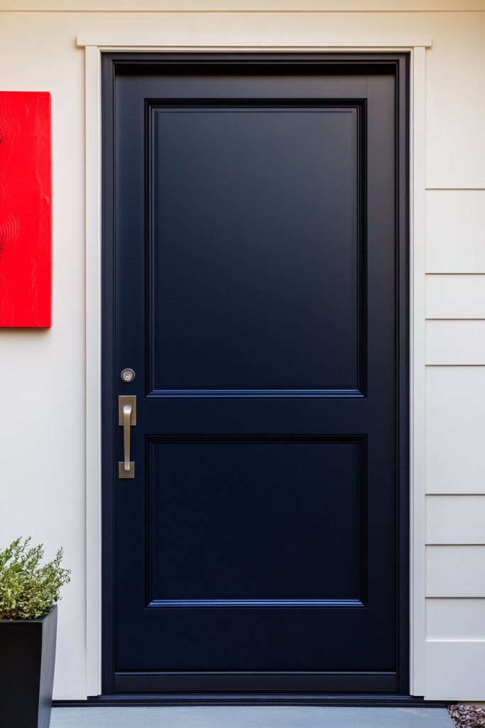 Imagine a simple, solid-colored door in a bold hue like navy, emerald, or bright yellow. Pair it with minimalist hardware and sleek, geometric planters or containers in neutral tones. The contrast creates a striking focal point that feels fresh and modern. Add a few carefully chosen accents—like a simple doormat or a statement lantern—to complete the look. The overall effect is clean, bold, and inviting.