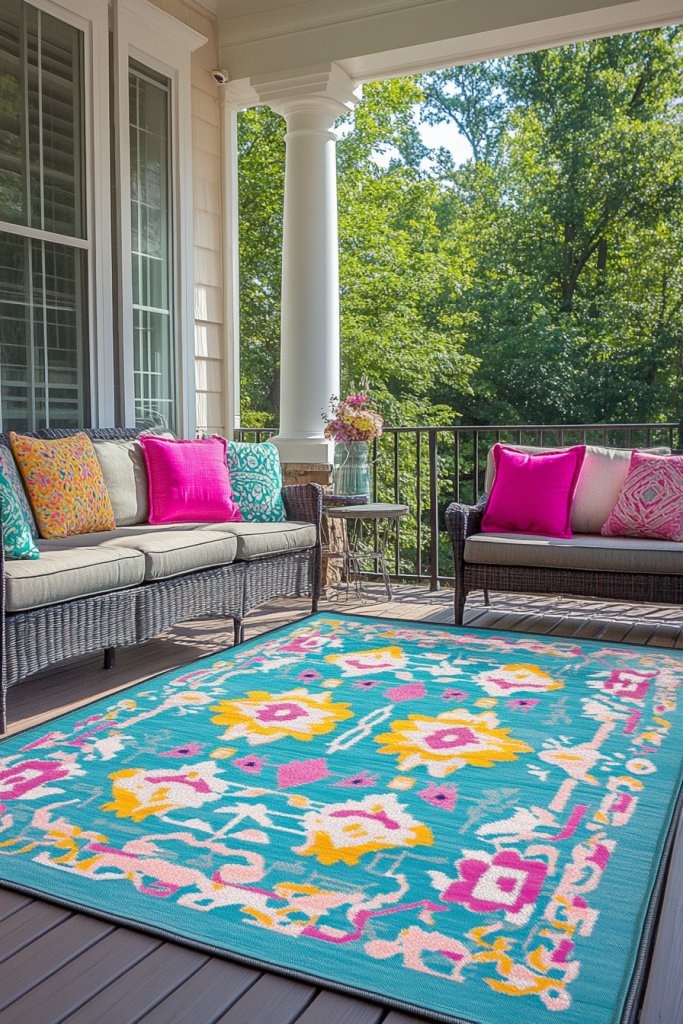 Is your porch lacking a focal point or sense of coziness? An outdoor rug with a bold pattern can tie the space together and add instant color. It creates a defined area for seating or decor, making your porch feel intentional and inviting. If your space feels disjointed or plain, a patterned rug can be the anchor you need.