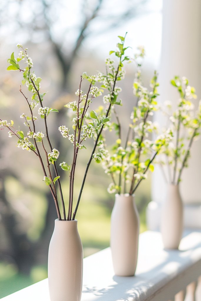Looking for a natural, minimalist way to add elegance to your porch? Displaying freshly cut spring branches in tall vases creates a simple yet striking focal point. It’s an effortless way to bring nature inside your decor without the maintenance of plants. If your porch feels empty or sterile, this idea adds a touch of seasonal freshness.