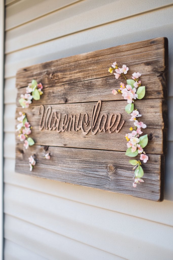 2. Rustic Wooden Welcome Sign with Spring Accents