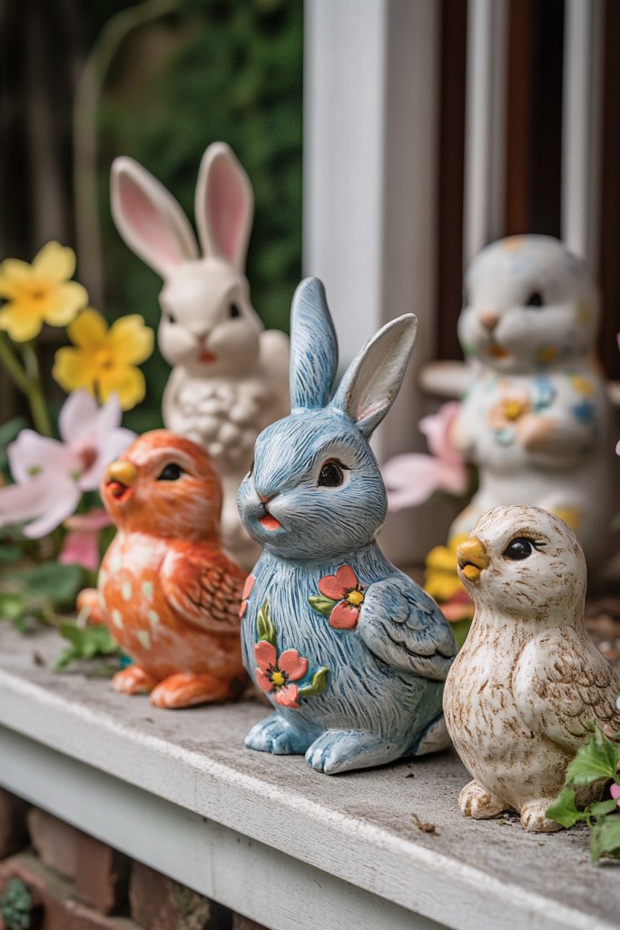 Imagine a cute ceramic bunny nestled near your door, or a metallic insect sculpture perched on a planter. These statues are crafted with detail and painted in cheerful spring colors—pinks, yellows, or soft greens. Positioned on pedestals, in flower beds, or on small tables, they add a playful touch that delights visitors. Their whimsical presence sets a lighthearted, welcoming tone.