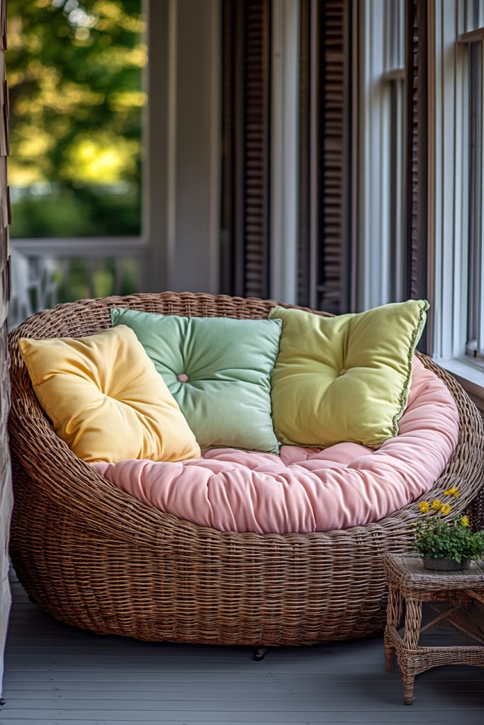 Mix and match pillow patterns and textures for a playful, personalized look. Add embroidered or monogrammed pillows for a special touch. Incorporate seasonal colors or motifs—like bright yellows and pinks for spring. You can also add small decorative accents like faux floral appliqués or tassels. This comfy setup turns your porch into a springtime retreat for reading, relaxing, or entertaining.