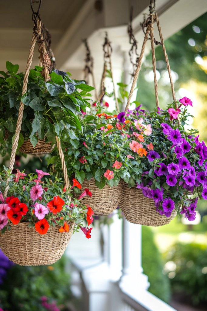 Does your porch look flat or uninspired? Hanging baskets are a quick way to add visual interest and a lush, layered look. They create vertical dimension without taking up ground space, which is perfect for small or crowded porches. If your entry feels dull, a few well-placed hanging baskets can make it vibrant and welcoming.