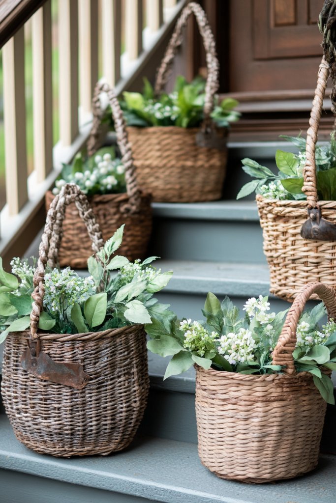Select baskets that suit your style and space, making sure they’re durable for outdoor conditions. Fill them with faux foliage, attaching with hot glue or floral wire for stability. Use hooks or brackets to hang wall-mounted baskets securely. Place larger baskets on the ground or on sturdy tables for a layered effect. Keep the faux foliage clean by dusting or gently wiping with a damp cloth. Mix and match textures and sizes for a curated, inviting look.