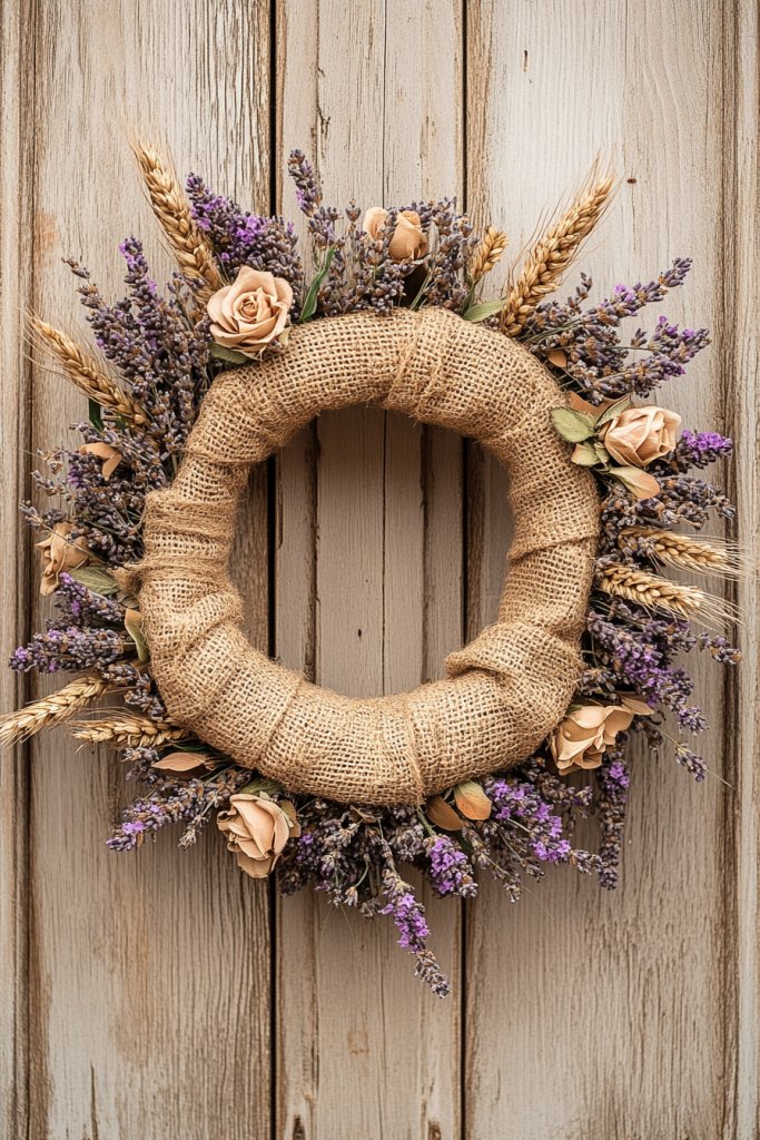 You can customize this wreath for different tastes—swap out dried lavender for fragrant rosemary or thyme for a culinary twist. For a more refined look, replace burlap with linen or muslin ribbons, or add a splash of color with pastel-colored fabric strips. Seasonal changes are easy—add faux berries or small twigs during winter or holiday seasons. For larger doors, opt for a wider wreath base, and for smaller entrances, create a mini version using thinner burlap strands. The beauty is in its versatility and rustic appeal.