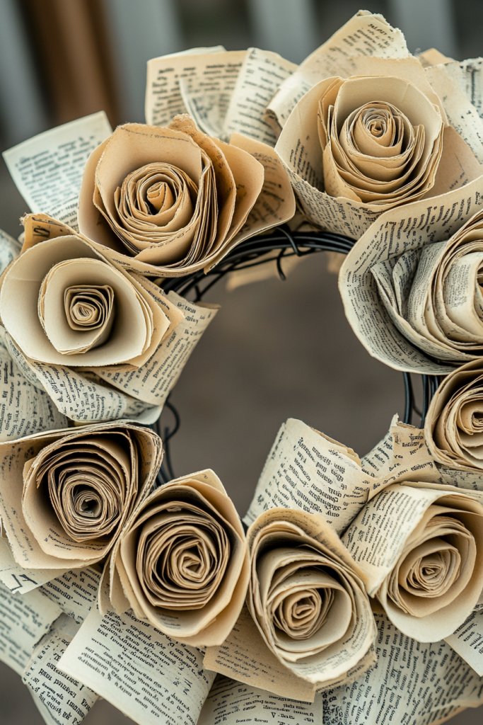 Visualize a wreath made from tightly rolled or layered vintage book pages, arranged into rosettes or a textured surface. The pages are often torn or distressed for a shabby chic look, with edges curled outward for dimension. The neutral tones of aged paper—creamy whites, browns, and sepias—create a soft, nostalgic palette. Perhaps some pages are stamped or illustrated, adding artistic detail. The final piece looks like a literary garden, full of textured blooms and layered stories, perfect for a cozy reading nook or cottage porch.