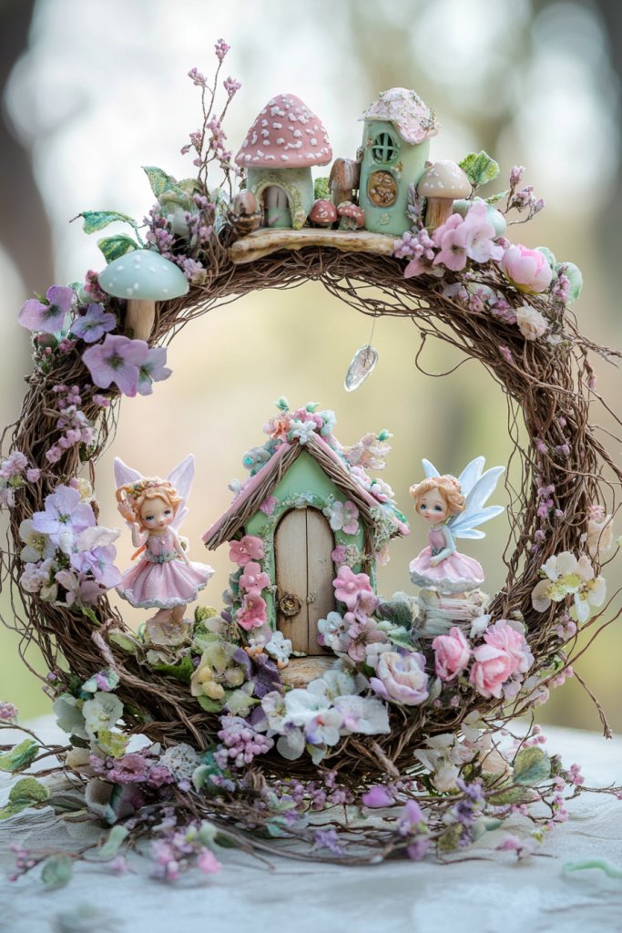 Picture a wreath decorated with miniature fairy figurines, tiny mushrooms, and faux moss, creating a lush, mystical scene. Tiny fairy doors or lanterns are nestled among faux greenery, while miniature toadstools and mushrooms add pops of red and white. Faux moss and twigs provide a woodland backdrop that feels alive and magical. The scene looks like a secret fairy garden, inviting curiosity and delight. It’s a playful, imaginative display that transforms a simple wreath into a storybook setting.