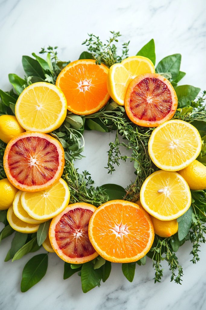 Start with a wire or foam wreath base, then attach citrus slices using hot glue or floral wire, working from the outside inward for even coverage. Layer green leaves in between or behind slices to add depth. Secure everything firmly and arrange for a balanced appearance. For extra durability, spray with a clear sealant, especially if using real fruit. Attach a hanging loop at the top with ribbon or wire. This project takes about 30 minutes and results in a fresh, lively wreath.
