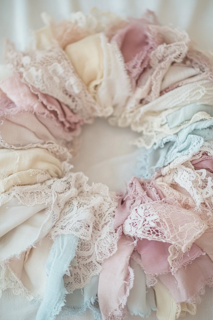 Imagine a wreath layered with pastel-colored fabric strips, gently frayed at the edges, creating a textured, layered look. Tiny lace accents peek through, adding a vintage lace trim that catches the light softly. The overall effect is a patchwork of soft pinks, creams, and light blues, with delicate ruffles fluttering in the breeze. It’s like a cozy quilt brought to life on your door.