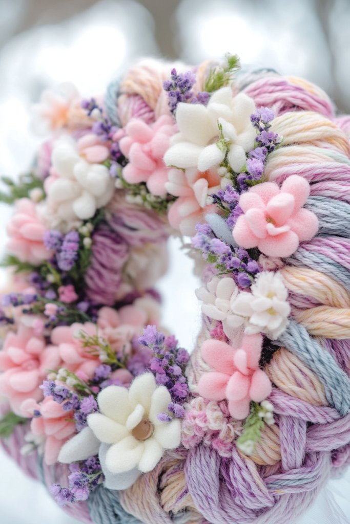 Imagine a neutral-toned wreath form entirely wrapped in soft, colorful yarns—think pastel pinks, blues, or even bold reds. Dot small faux blooms sporadically across the surface, adding pops of color and a three-dimensional effect. The yarn’s texture creates a warm, inviting visual, with a slight fuzziness that resembles a cozy sweater. It’s a playful yet elegant look, perfect for spring’s cheerful vibe.