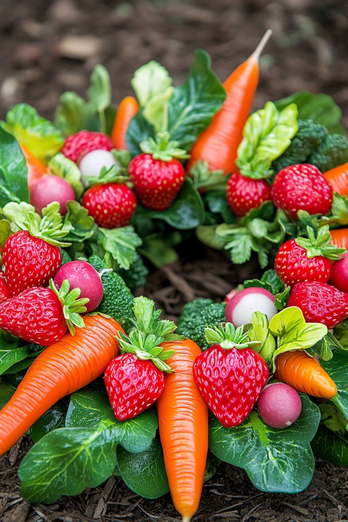 Picture a circular wreath adorned with faux radishes, carrots, strawberries, and leafy greens—each piece bursting with color and detail. The produce is arranged in a balanced, abundant display, resembling a farmers market stall. The textures of the fruits and veggies contrast beautifully with the natural grapevine base, creating a lively, inviting scene. It’s like a miniature garden of edible delights frozen in time.
