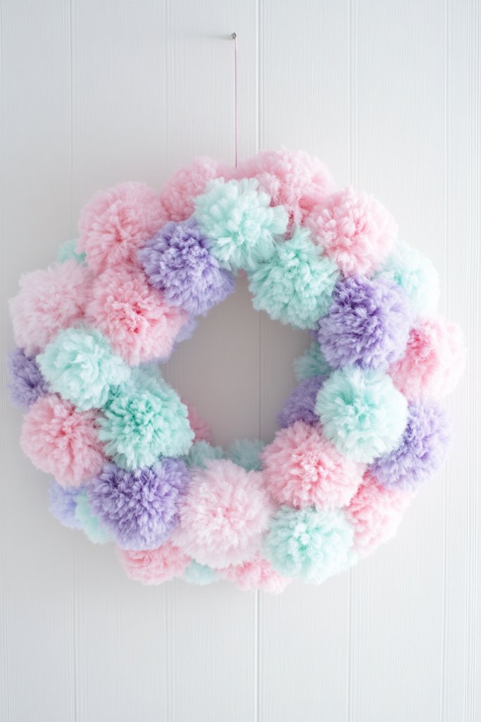 You can adjust the color palette to match your personal style—go bold with hot pinks and turquoise or keep it subtle with pastel blues and peaches. For a more sophisticated look, opt for smaller or more muted pom-poms, or combine with fabric flowers for added texture. Seasonal swaps are simple: swap out color schemes for brighter summer hues or deeper shades for early autumn. For a more minimalist approach, create a monochrome wreath with varying shades of one color. The key is in the playful combination of textures and hues.