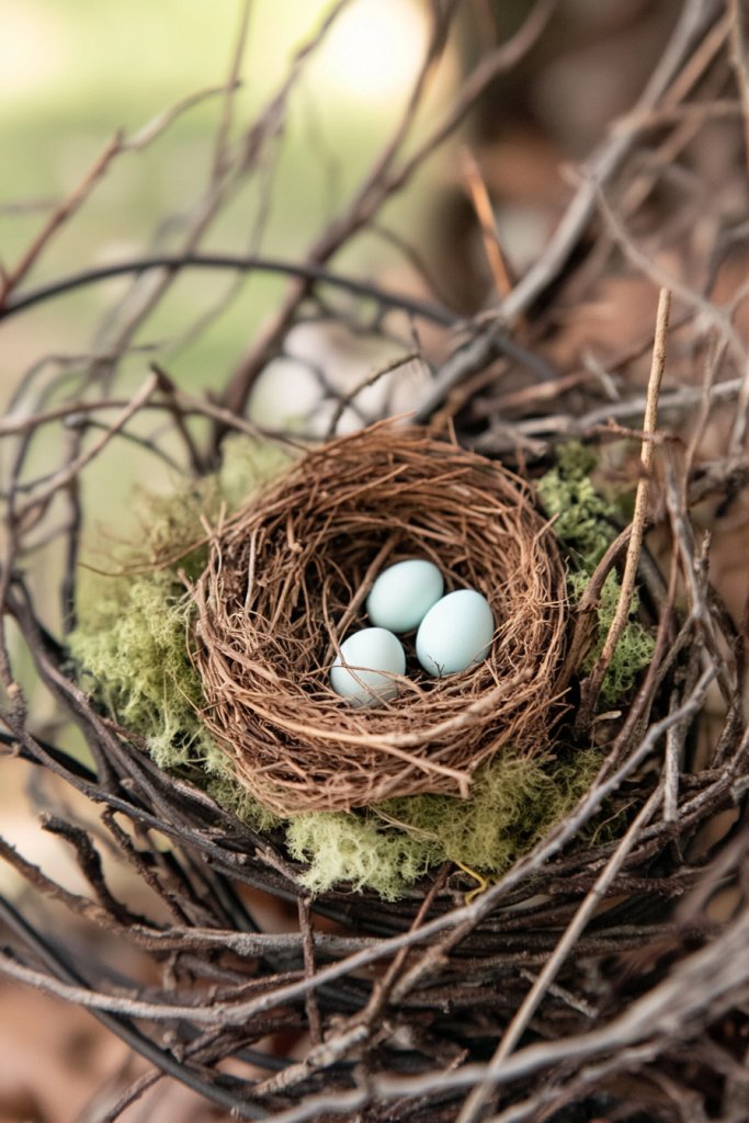 Picture a wreath made of intertwined grapevines, adorned with tiny faux or real bird nests nestled among sprigs of moss and twigs. Small, pastel-colored eggs peek out from the nests, while miniature bird figurines perch nearby. The natural textures of the vines, combined with the delicate eggs and nests, create a layered, earthy composition. The entire piece evokes a sense of early spring mornings, chirping birds, and budding nests. It’s a charming, vintage-inspired scene that feels both cozy and whimsical.