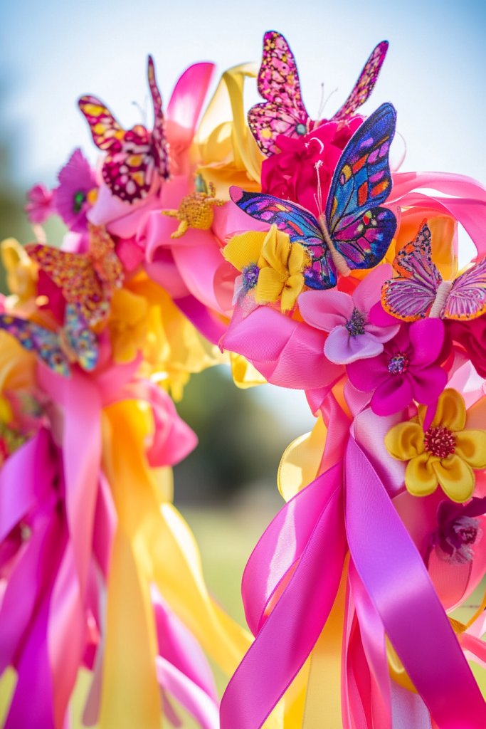 Change up the ribbon styles—try satin for elegance, burlap for rustic charm, or sheer organza for a fairy-tale look. Switch butterfly colors to match your decor or the season—bright and bold for summer, pastel for spring. Incorporate different flower types and sizes, from tiny daisies to large peonies, for a layered, textured appearance. For a more understated look, use a single ribbon color with minimalist butterfly accents. The concept adapts easily to your personal style and space constraints.