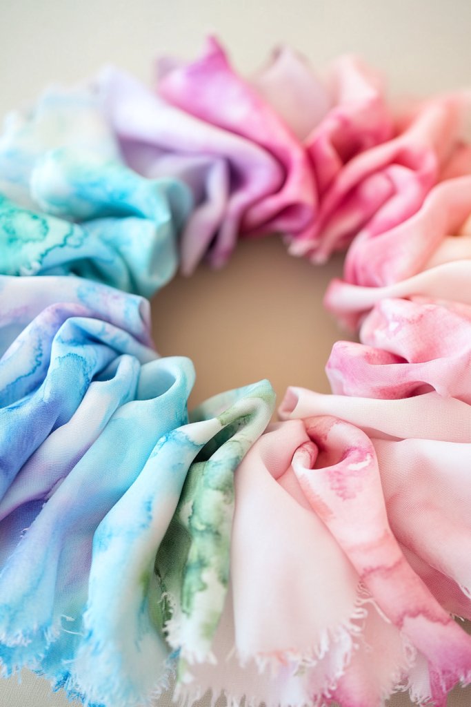 Cut fabric into strips or shapes—either simple rectangles or more intricate floral motifs. Wrap a wreath form with a base fabric or felt for stability, then secure your fabric strips using hot glue or sewing. Arrange the fabric in a layered, overlapping pattern, creating a painterly effect. Add small fabric flowers or rosettes by sewing or gluing, placing them to mimic watercolor brushstrokes. Finish with a fabric loop or ribbon for hanging. This project takes about 45 minutes and results in a soft, artistic wreath.