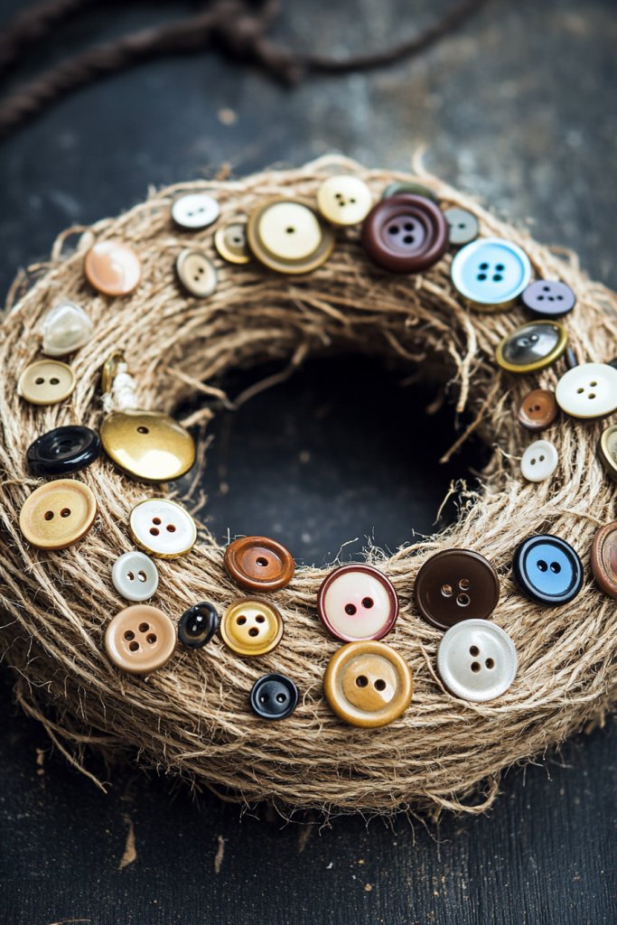 Visualize a wreath base wrapped tightly with natural twine, creating a textured, earthy backdrop. Sew or glue colorful buttons—shaped like flowers, insects, or simply in cheerful hues—onto the twine in a random or patterned arrangement. The buttons add pops of color and a tactile element, contrasting beautifully with the rustic twine. It hangs on your door, exuding a cozy, vintage vibe reminiscent of country kitchens or garden sheds. The combination of textures and colors makes it both playful and inviting.