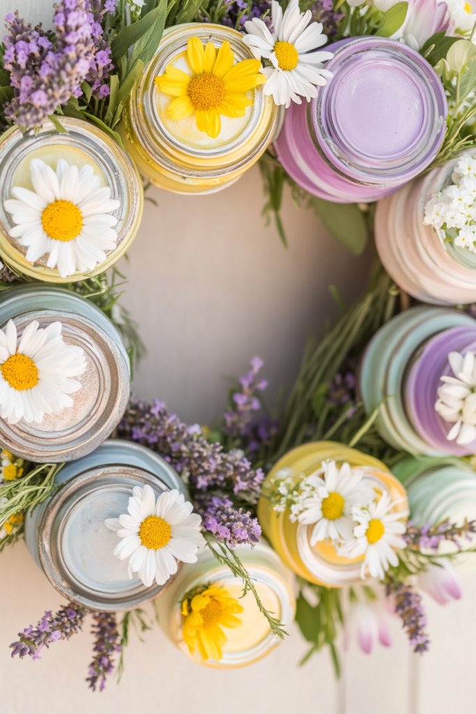 Picture a circular wreath made from vintage or repurposed mason jar lids, each filled with faux or dried spring flowers—daisies, small roses, or wildflowers. The lids are arranged tightly together, creating a textured, metallic border that frames the floral display. The flowers spill slightly over the edges, adding dimension and softness to the metallic base. It’s a nostalgic nod to old-time preserves, but with a fresh, floral twist that fits perfectly into a spring garden or cottage aesthetic. The whole piece exudes a homemade, heartfelt vibe.