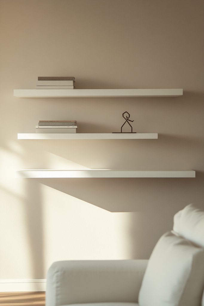 The shelves hold a few carefully chosen objects—perhaps a ceramic bowl, a stack of design books, and a small sculpture—creating a balanced display. The concealed brackets give the illusion that the shelves are suspended in air, adding to the room’s airy feel.