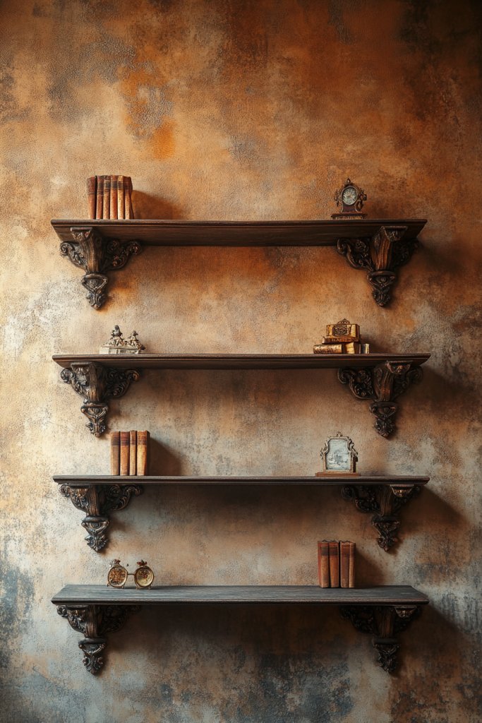 Choose brackets with detailed designs—think scrollwork, filigree, or floral motifs—and measure your wall space accordingly. Mount the brackets into wall studs or secure with heavy-duty anchors, ensuring they support the weight of the shelves and objects.