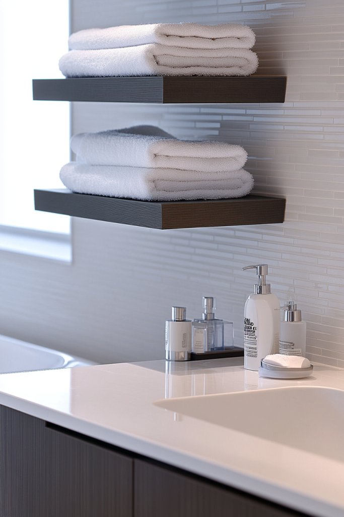 12. Floating Shelves in the Bathroom for Towel and Accessory Storage