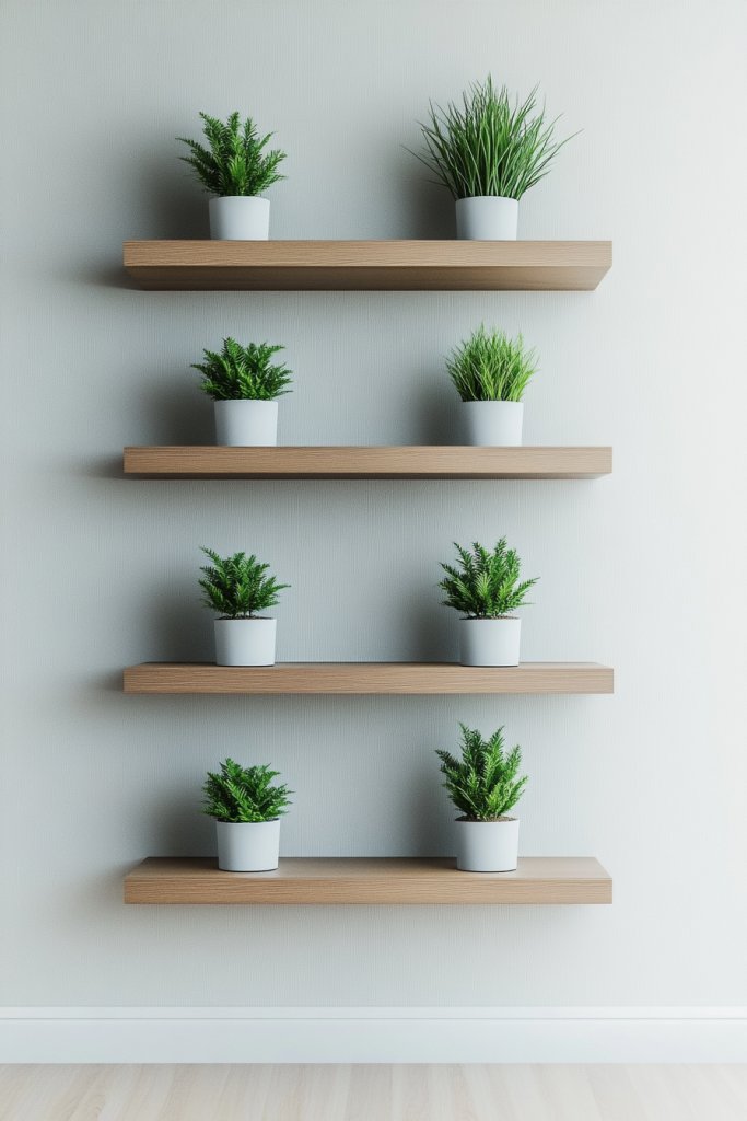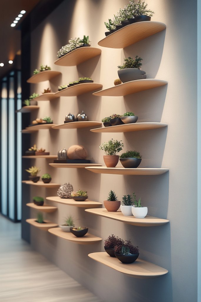 Who says you can’t enjoy a bit of nature indoors? Visualize a series of narrow shelves mounted at different heights, each supporting small potted faux succulents or air plants. The plants add a pop of green against a neutral or textured wall, creating a lively, vibrant backdrop.