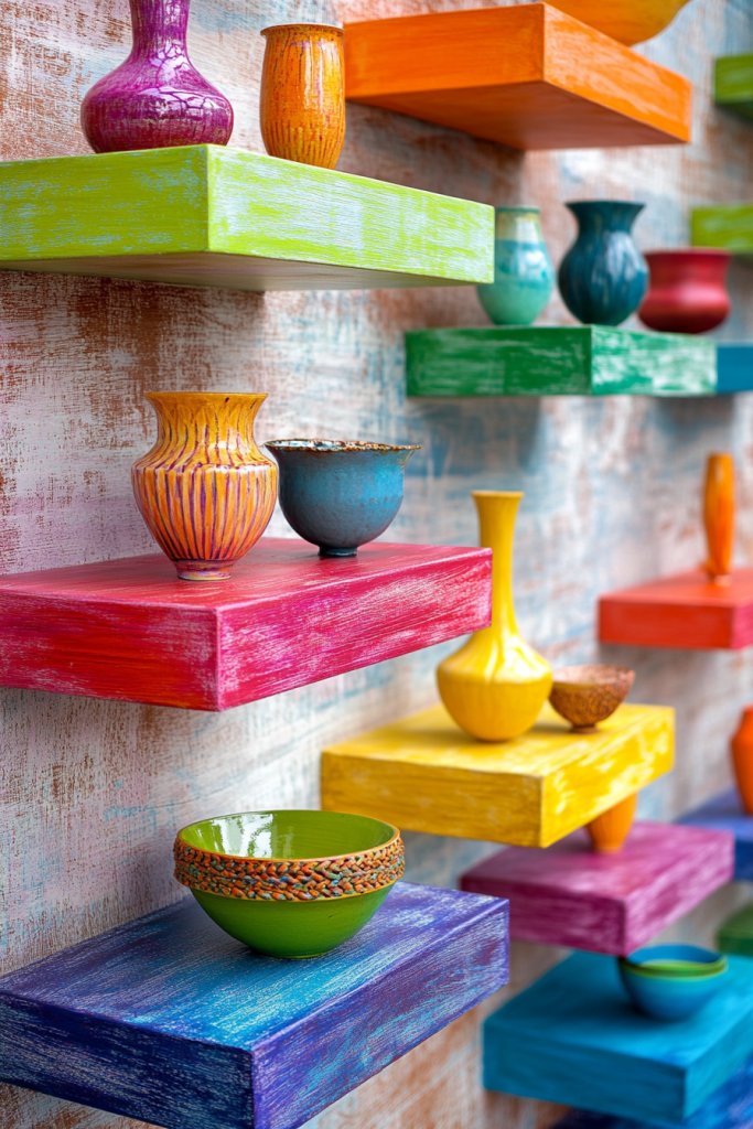 Who doesn’t want a room that feels lively and inviting? Picture shelves painted in bold hues like navy, mustard, or emerald, mounted against a neutral wall. The shelves hold a mix of items—perhaps colorful ceramics, textured baskets, or patterned textiles—that complement the finish.
