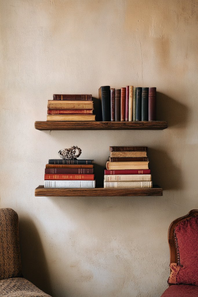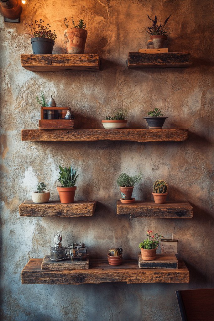 Multi-tiered floating shelves turn a blank wall into a layered, lively showcase. They’re practical and visually appealing, making your space feel curated and intentional.