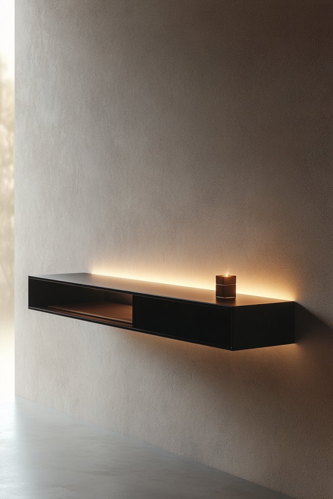 Who doesn’t want their home to feel a little more magical? Visualize a sleek, narrow shelf mounted high on the wall with integrated LED strip lighting. The light casts a gentle glow onto nearby objects—perhaps a collection of textured ceramics or a decorative tray—adding depth and warmth.