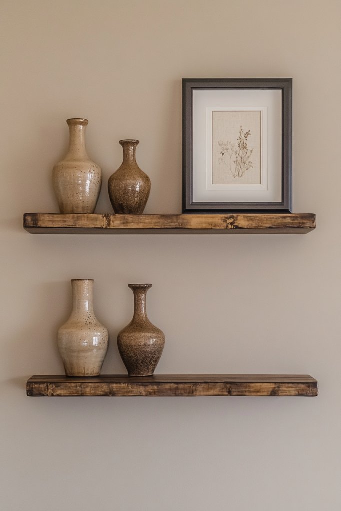 Who doesn’t want their walls to look perfectly curated? Visualize two matching shelves hung at equal heights on a wall painted in a neutral tone. Each shelf holds a set of coordinated objects—perhaps matching ceramic bowls, stacked books, or small decorative boxes—creating a mirror image effect.