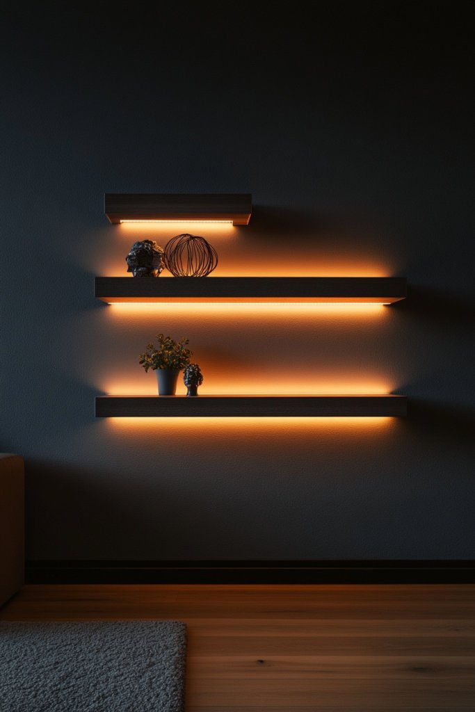 7. Floating Shelves with Built-in Lighting for Ambient Glow