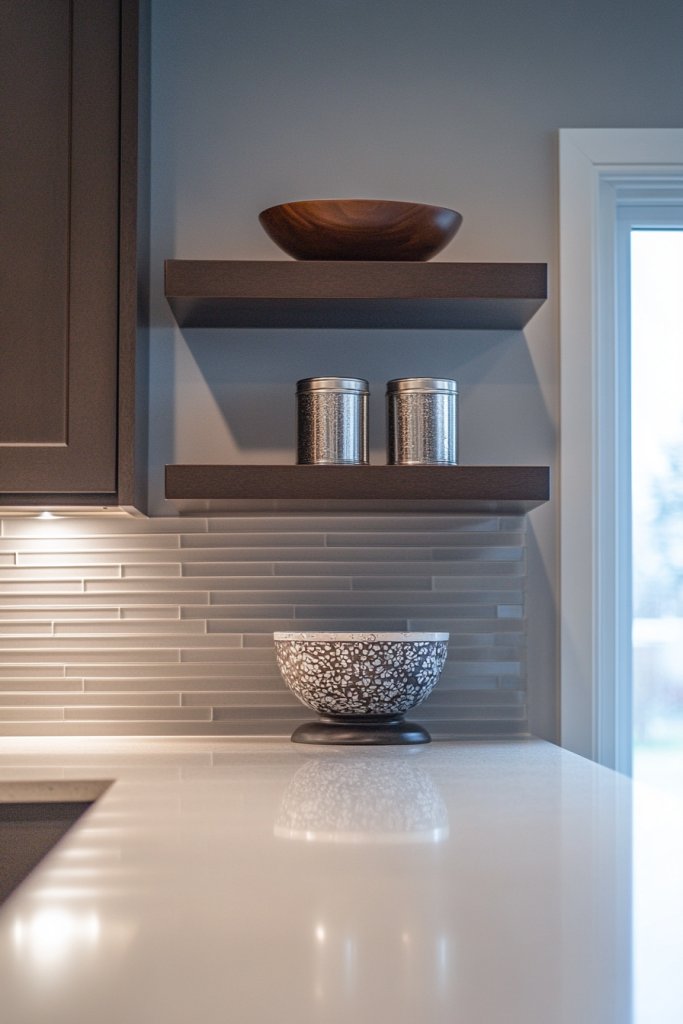 No more digging through cabinets for spices or mugs—just grab and go. Who says practicality can’t be pretty? Imagine a set of sleek, white floating shelves mounted above a subway tile backsplash.