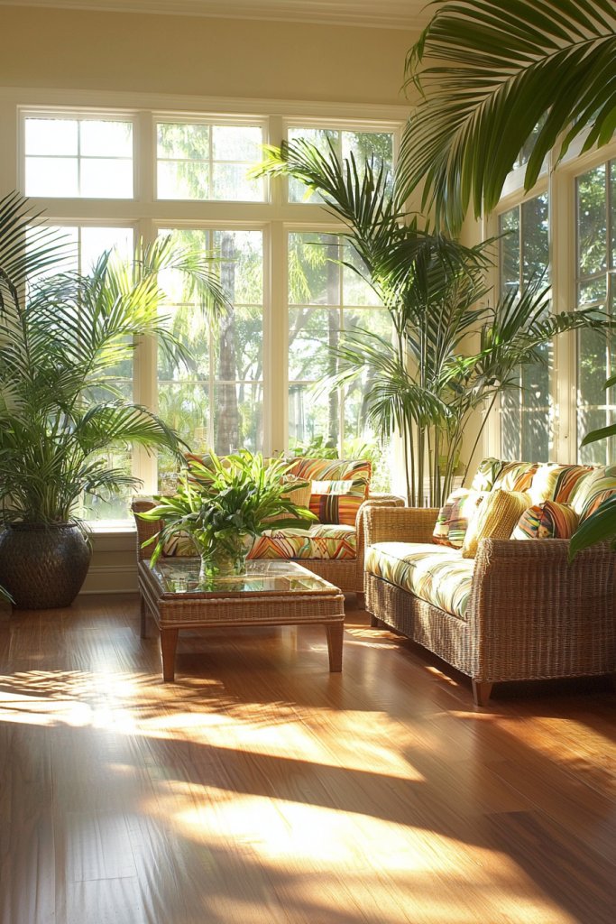Don’t forget the lighting; rattan pendant lights or lanterns can cast a warm, cozy glow. Finally, add a few tropical-inspired accessories like seashells or driftwood to tie it all together. Your sunroom will soon be a serene retreat, perfect for relaxation and rejuvenation.