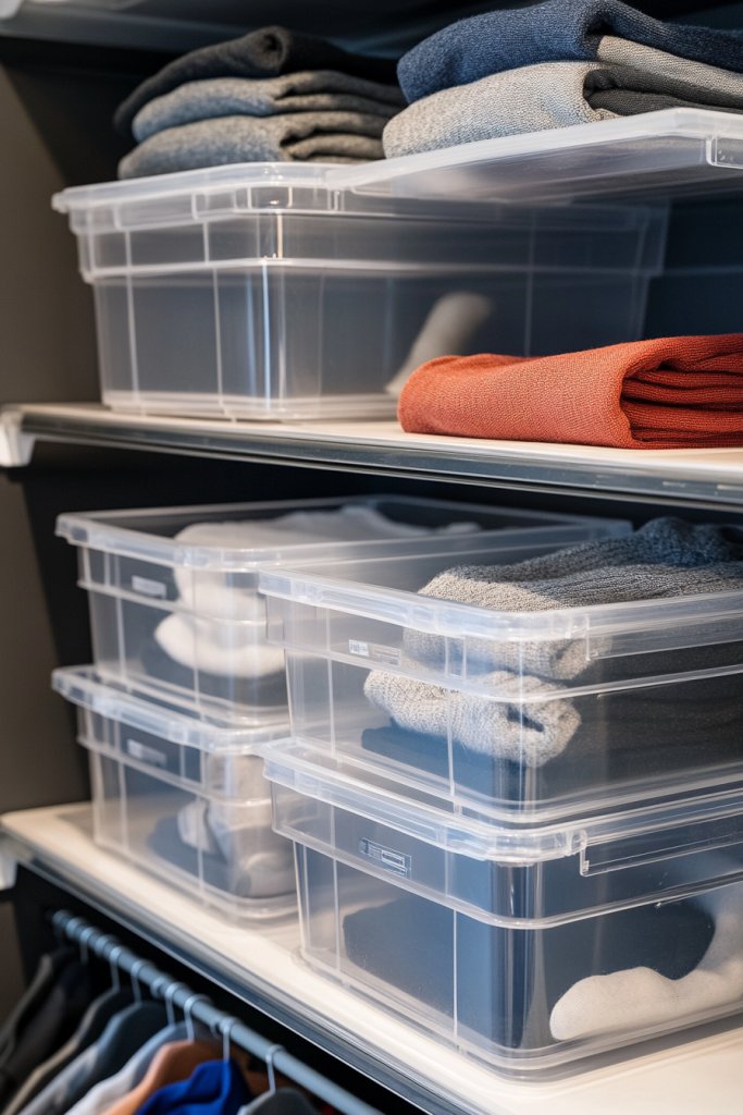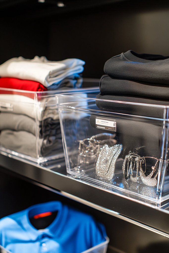 Imagine transparent containers stacked neatly on shelves, their contents visible without rummaging. Brightly colored socks, folded T-shirts, or accessories all peek through the clear plastic, creating an organized mosaic. The uniformity of the bins lifts the cluttered look, making it easier to grab what you need at a glance. It’s like turning your closet into a sleek retail display.