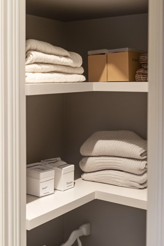 Picture a triangular shelf snugly fitted into your closet corner, holding neatly folded sweaters or decorative boxes. The shelves create a geometric pattern that adds visual interest to the space. Items are easily accessible, and the entire corner transforms into a tidy, organized nook. It’s a clever way to maximize every inch.